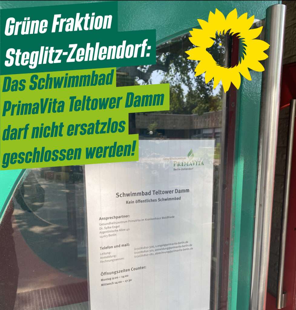 Vor wenigen Tagen hat die BIM (Berliner Immobilienmanagement) dem Schwimmbad PrimaVita am Teltower Damm das Nutzungsrecht zum Jahresende 2023 gekündigt. Gemeinsam mit der Senatsverwaltung für Gesundheit und der Senatsverwaltung für Sport hat die Senatsverwaltung für Schule beschlossen, dass das Schwimmbad einem Mensaneubau für die JFK-Schule weichen muss. Durch die ersatzlose Schließung fallen ca. 100 Kinderschwimm- und Wassergewöhnungskurse weg, zusätzlich zahlreiche Aqua-Gymnastik- und Reha-Kurse für Seniorinnen und Senioren. Selbst die Schwimmschule „Seesternchen“ und die DLRG Charlottenburg bieten im berlinweit einmaligen Bad mit verstellbarem Hubboden Schwimmkurse für Kinder an. All das fällt nun zum Ende des Jahres 2023 ersatzlos weg und kann durch andere Schwimmhallen nicht aufgefangen werden.