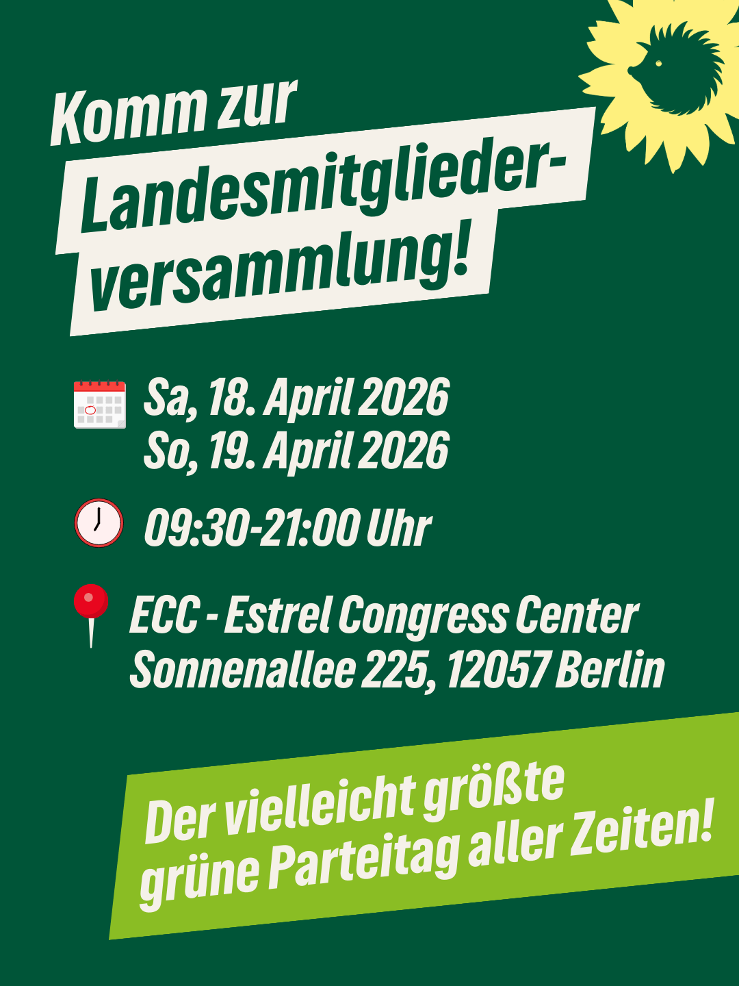 Liebe Mitglieder, Berlin steht vor einer Richtungsentscheidung – und wir treffen sie gemeinsam! Am 18. und 19. April 2026 stellen wir auf unserer Landesmitgliederversammlung (LMV) die Landesliste für die nächste Abgeordnetenhauswahl am 20. September 2026 auf. Dazu möchten wir dich herzlich einladen: 18. und 19. April 2026, jeweils 09:30 Uhr bis 21:00 Uhr (Einlass jeweils ab 08:00 Uhr) ECC Berlin ... |